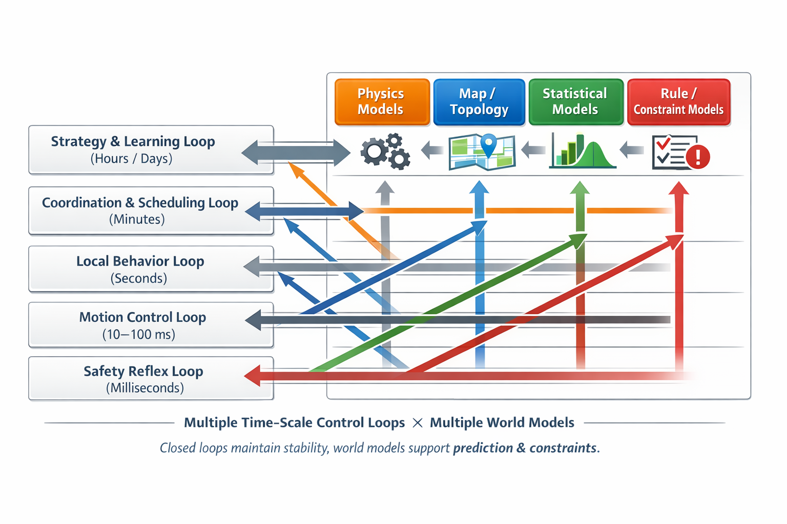 这些闭环内部使用的模型并不相同:安全闭环偏"最坏情况/保守模型",控制闭环偏动力学模型,协调闭环偏拓扑/规则模型,优化闭环偏统计/仿真模型。它们共同服务一个现象,但模型是"多套并存"的。
