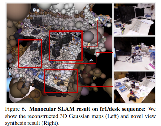 图 6 展示了 TUM fr1/desk 序列的单目重建结果,高斯的位置分布符合几何合理性,3D 一致性好,新颖视图合成能够准确还原场景细节。