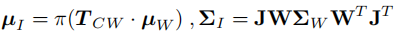 为相机位姿(从世界坐标系到相机坐标系的变换);是投影变换线性近似的雅可比矩阵;