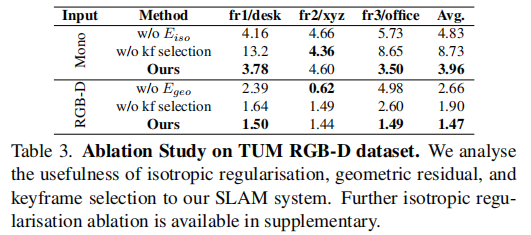- 几何残差(Egeo):RGB-D 设置下,加入几何残差后 ATE RMSE 从 2.66cm 降至 1.47cm;