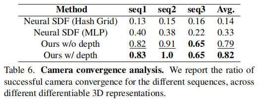 表 6 不同 3D 表示形式的相机收敛成功率