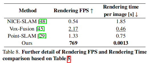 - 渲染速度达到 769fps,每帧渲染时间仅 0.0013 秒,是其他方法的数百倍(如 NICE-SLAM:0.54fps,Point-SLAM:1.33fps)。