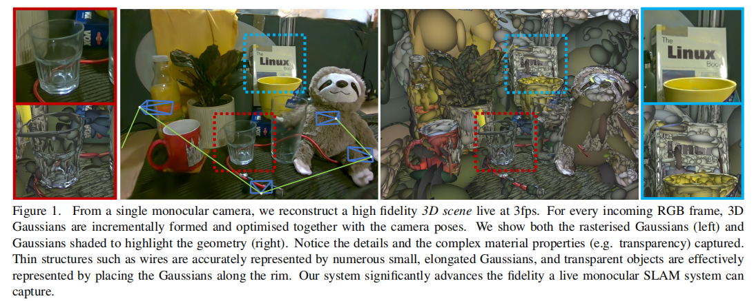 此前,3DGS 仅用于离线场景重建,且需要已知相机位姿(通常由离线运动恢复结构(SfM)系统提供)。部分工作将其扩展到动态场景捕获、3D 生成等任务,但均未涉及在线 SLAM 的核心挑战 ------ 实时相机位姿估计与增量地图构建的联合优化。