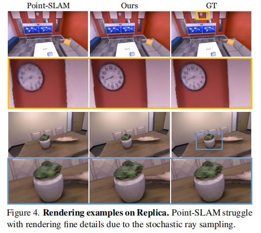 值得注意的是,Point-SLAM 依赖深度引导的光线采样,限制了其新颖视图合成能力,而论文的光栅化方法无需深度引导,即可实现高效高保真的新颖视图渲染(图 4)。