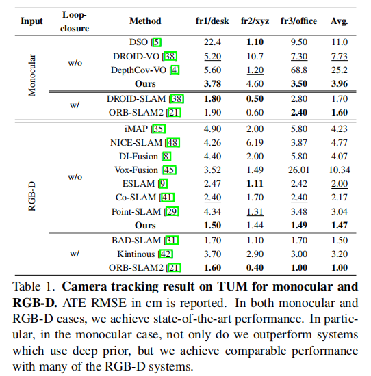 - RGB-D 设置:论文方法的 ATE RMSE 平均为 1.47cm,优于所有基线方法,甚至在 fr1 序列中超过 ORB-SLAM2。