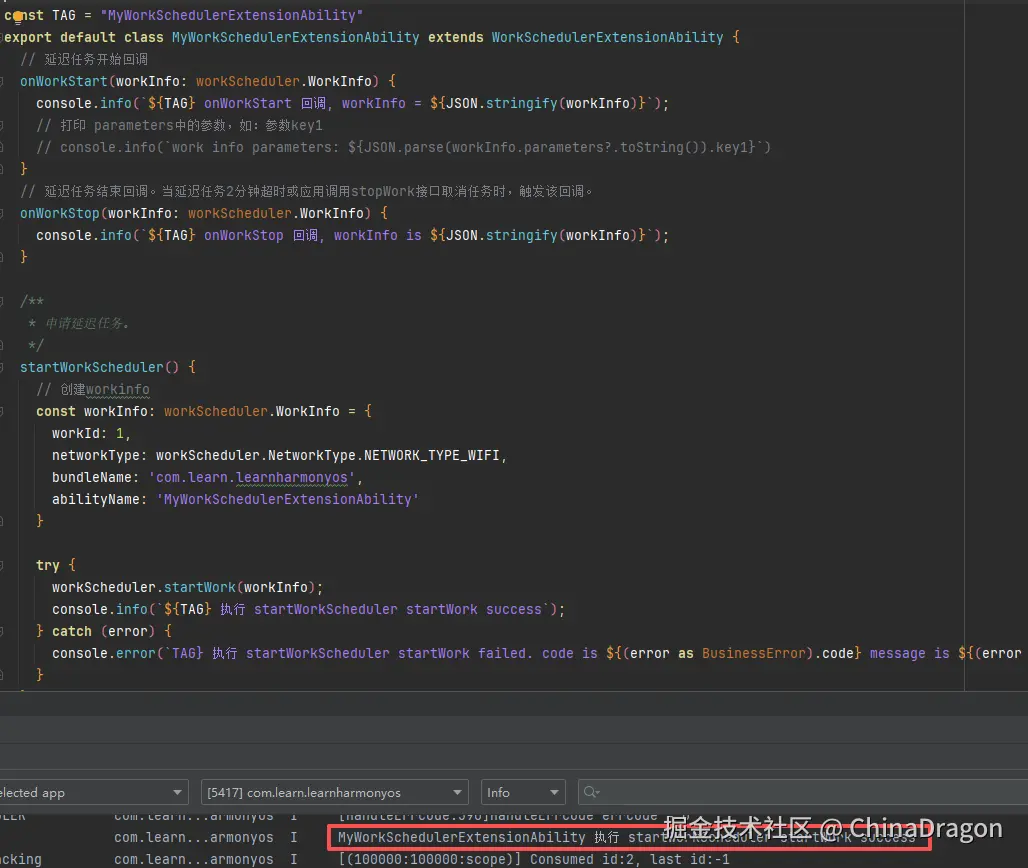 console.info(`${TAG} 执行 startWorkScheduler startWork success`);
