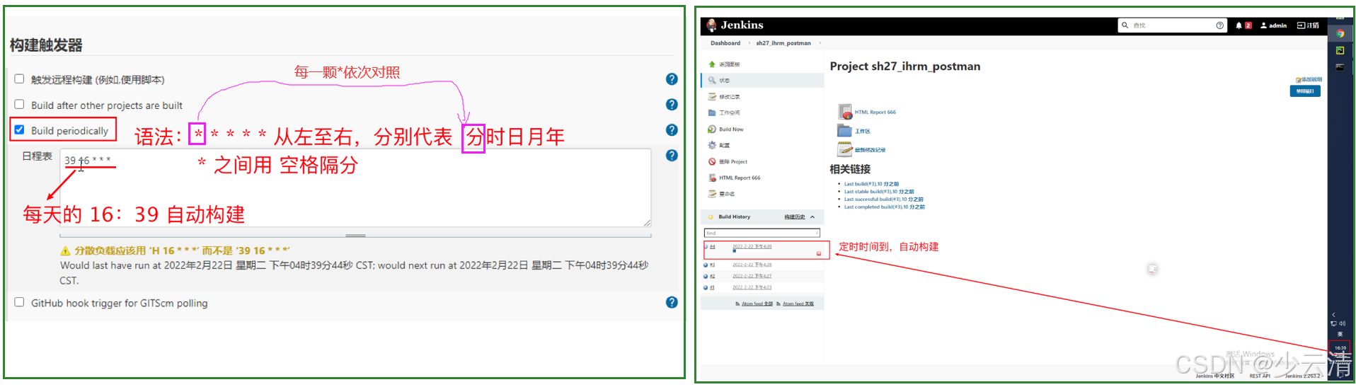 简单来说:自动构建,就是设置一个定时器,定时时间到, Jenkins 自动执行测试用例。