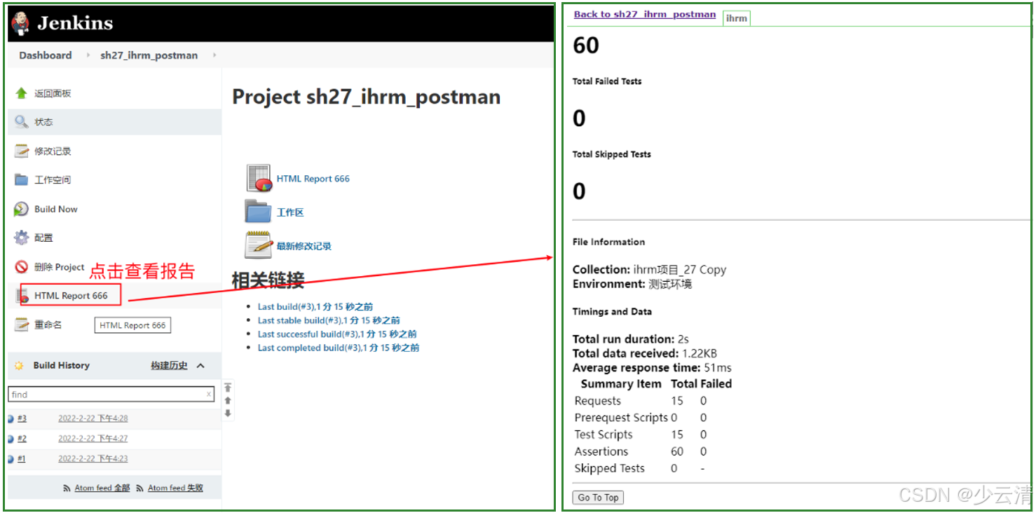 1、Jenkins 首页,点击任务名:如:sh_27_ihrm_postman。点击跳至 "配置" 页面。