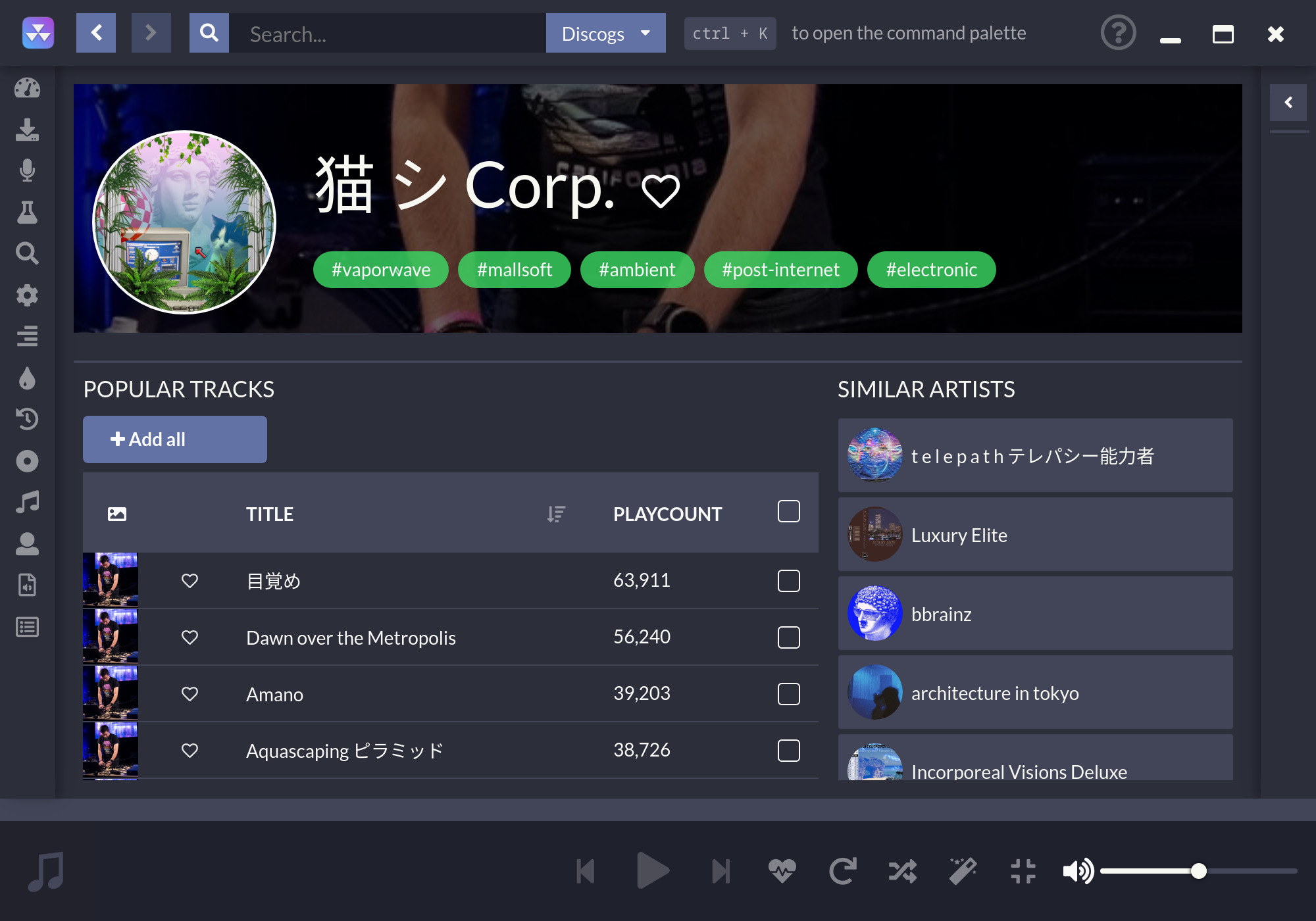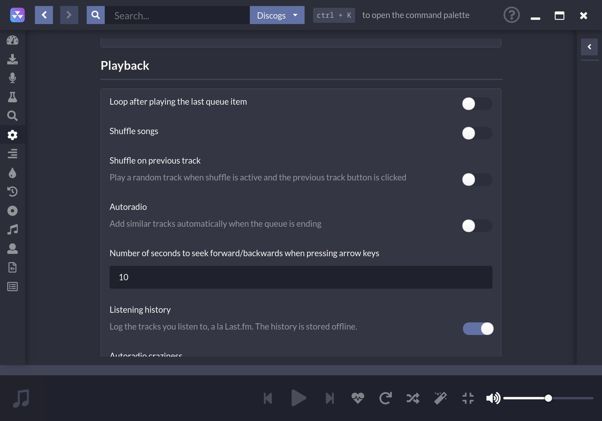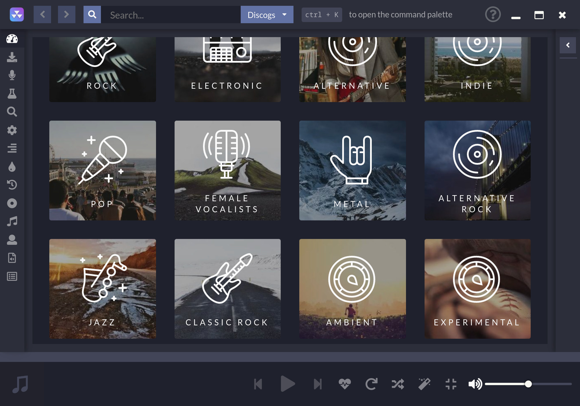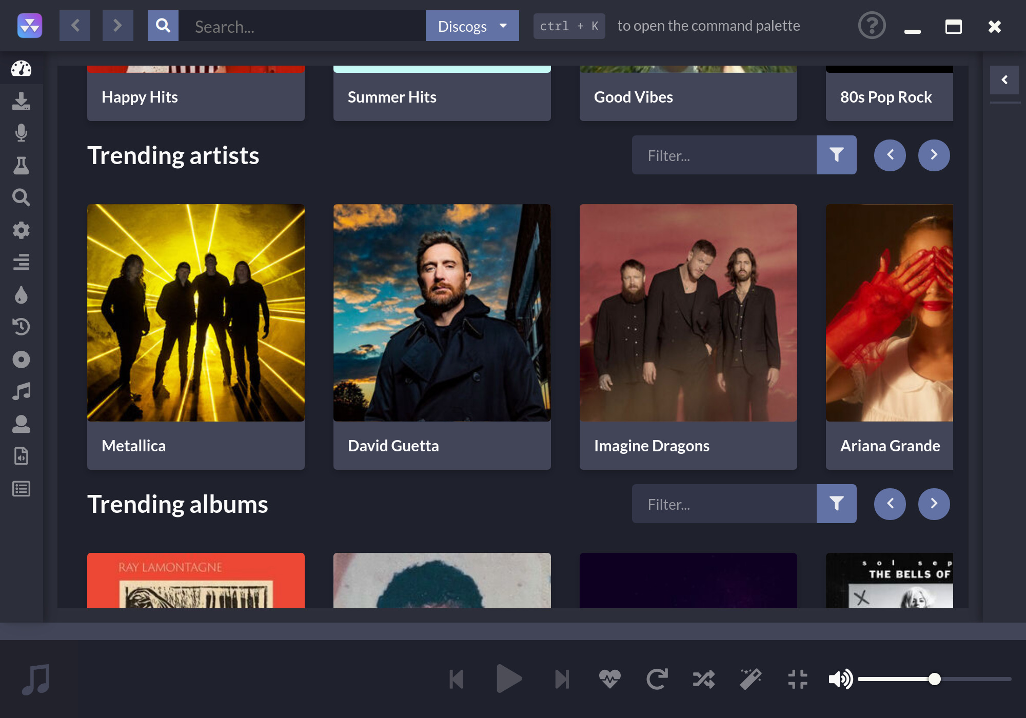 - 专辑搜索:通过Last.fm和Discogs提供专辑搜索、专辑视图,基于艺术家和曲目名称自动查找歌曲(该功能正在进行中,可能偶尔出现问题)。