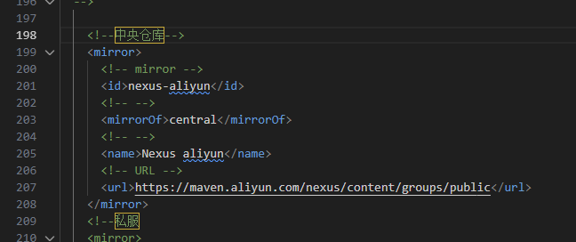 在settings.xml配置文件中,加入如下代码,配置阿里云镜像仓库: