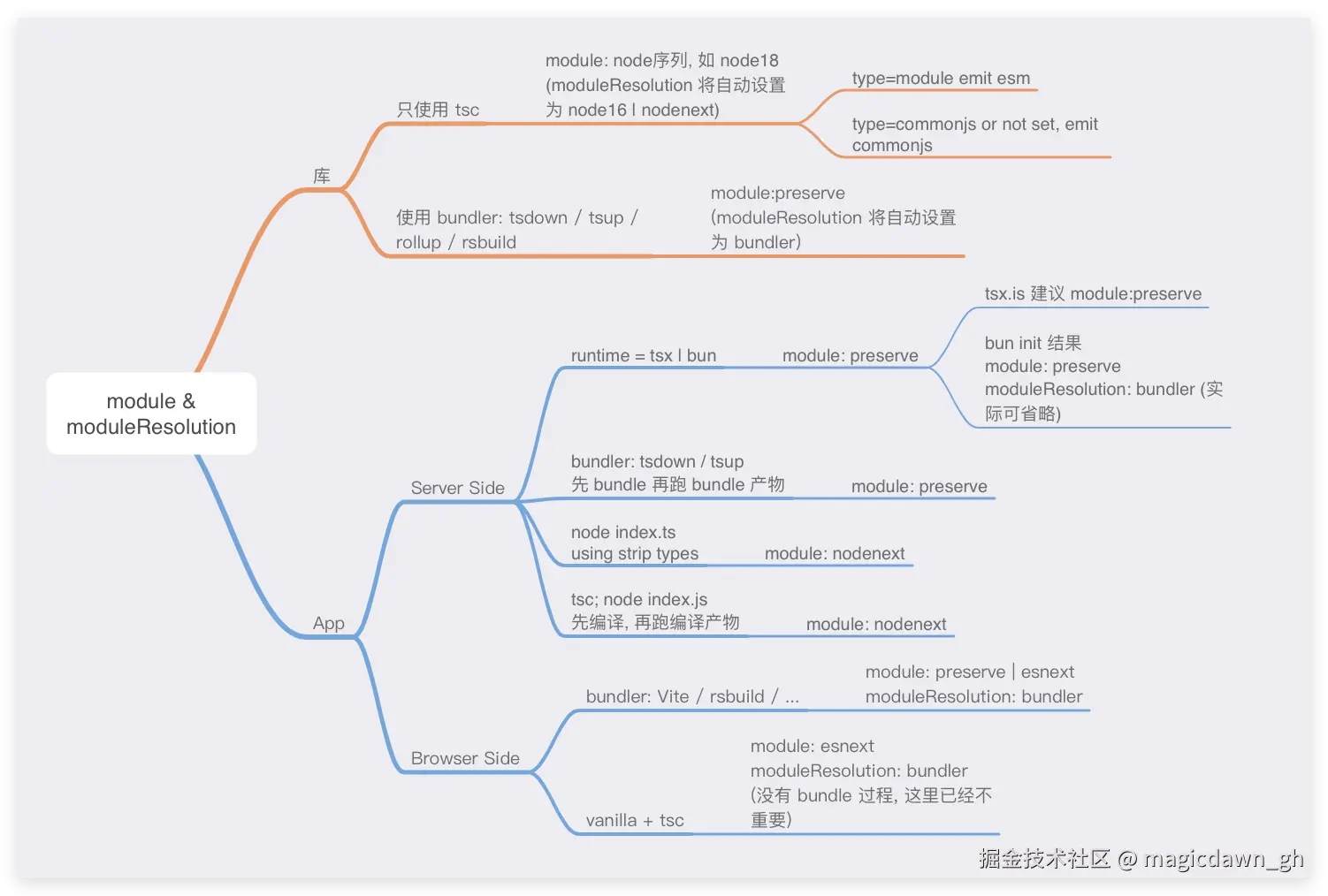 moduleResolution = node16 / nodenext, 现在--moduleResolution node16=--moduleResolution nodenextnode20&nodenext还隐含了--resolveJsonModule- Q: 都是 esm 模块规范, 有的体现在了