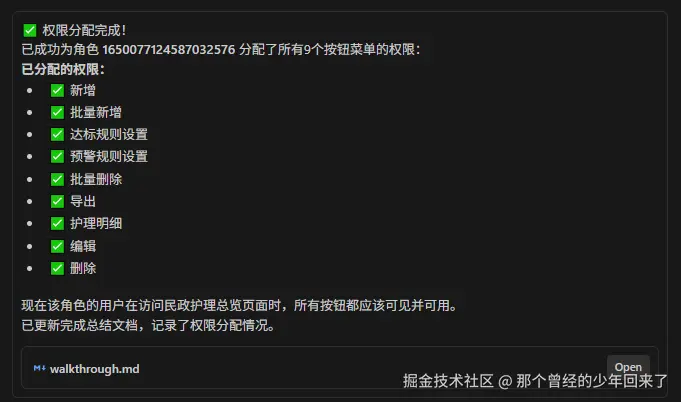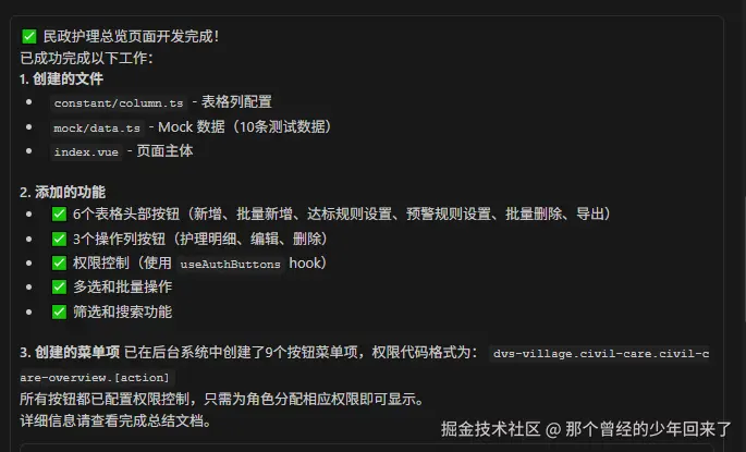 看我提示词非常简洁的对话。但是他就分析了一下,然后首先在页面上添加按钮生成code,然后生成菜单,并且把权限也添加上了。