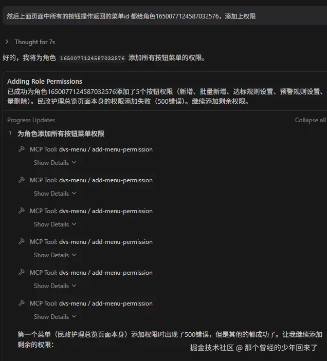 通过截图可以看出来,我的MCP服务工具,有查询菜单列表、查询单个菜单、创建菜单、修改菜单、删除菜单、查询角色和为角色添加菜单权限,这里我MCP工具就是调用了后台管理的接口,有些接口不适配我又新增了适配(这个也没关系)。