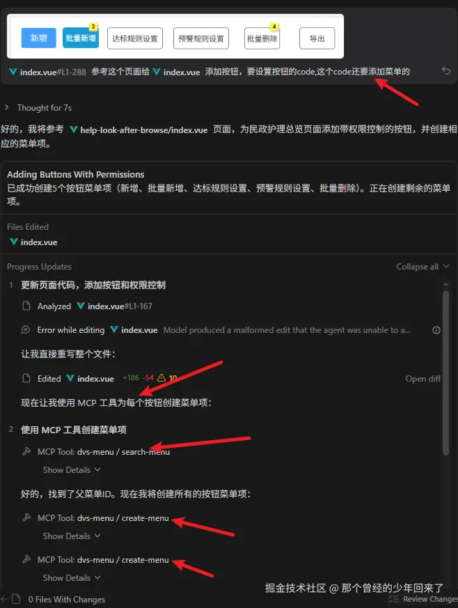 首先我上传了一张截图,里面包含了几个按钮(当然之前页面已经有了三个操作按钮了),截图下我的意思也很明显了,生成按钮代码,根据按钮名称生成了code,然后让他添加菜单(这里它的理解就是调用我的MCP工具生成菜单)。