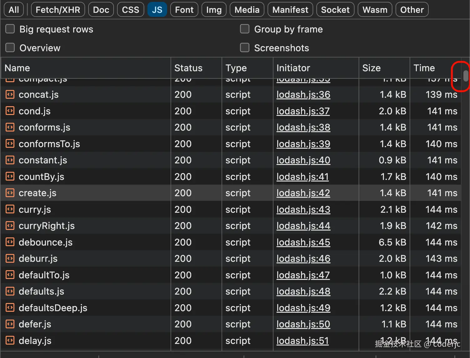 可以看到,这个 lodash 请求数量都集中到一个文件,那么网络开销就少得多。而虽然这个文件的体积大很多,但是只需要进行一次网络的传输就可以了。这种大家可以尝试用一个较小的 node_modules 目录,进行复制传输或者打包压缩,它的时间比正常大文件的时间要多的多,