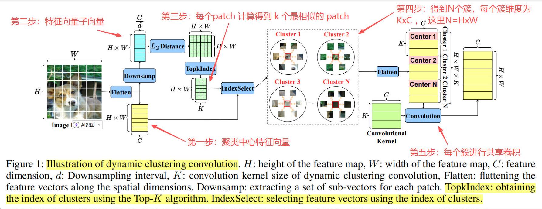 核心思想: 通过全局聚类将语义相似的图像块分组为簇,再对每个簇使用共享卷积核进行卷积操作。既保留 CNN 的归纳偏置和计算效率,又获得类似 Transformer 的全局建模能力。