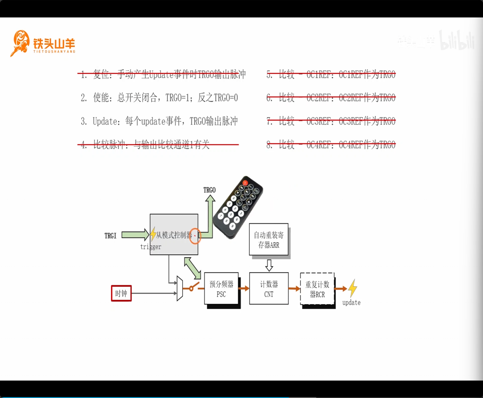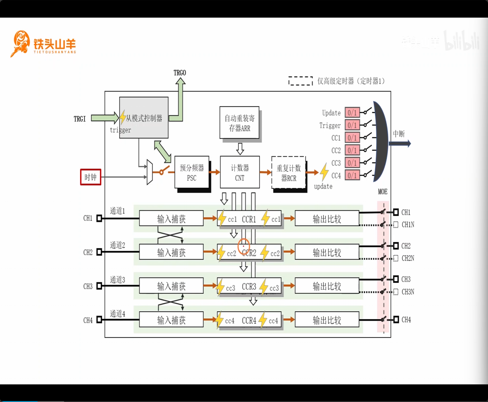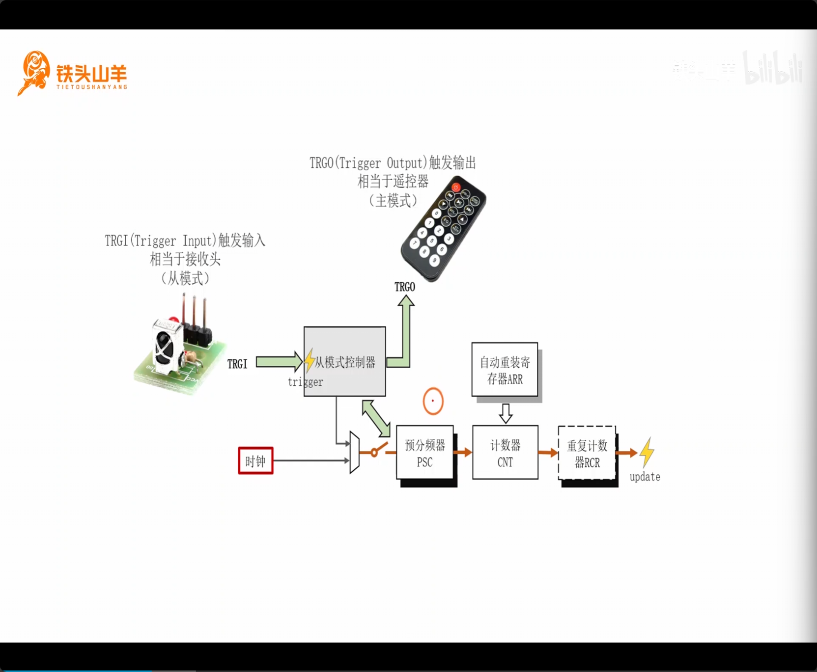 TRGO 向外发送命令,比如控制另外一个定时器做相应动作(级联),比如控制 ADC 模块的采样时基等等。