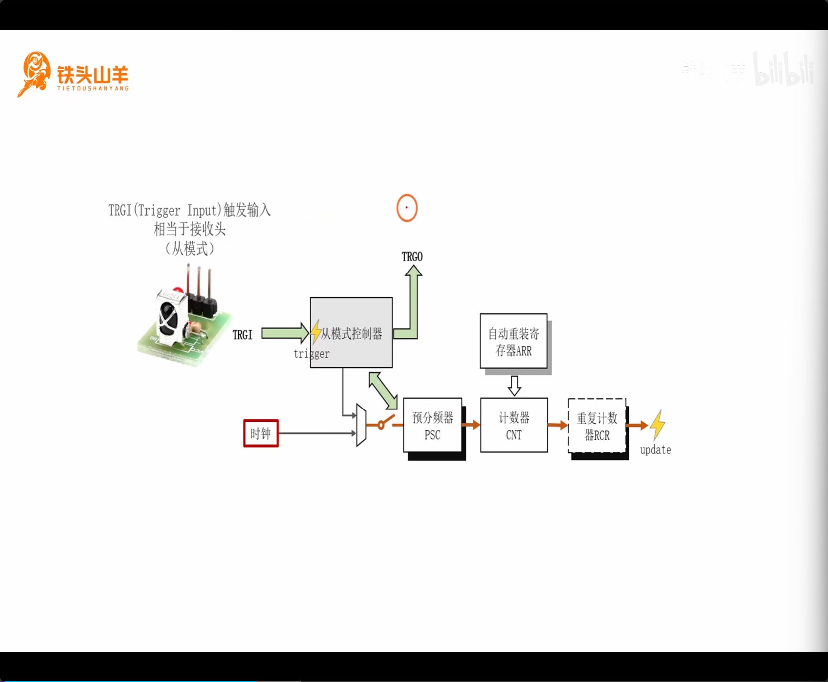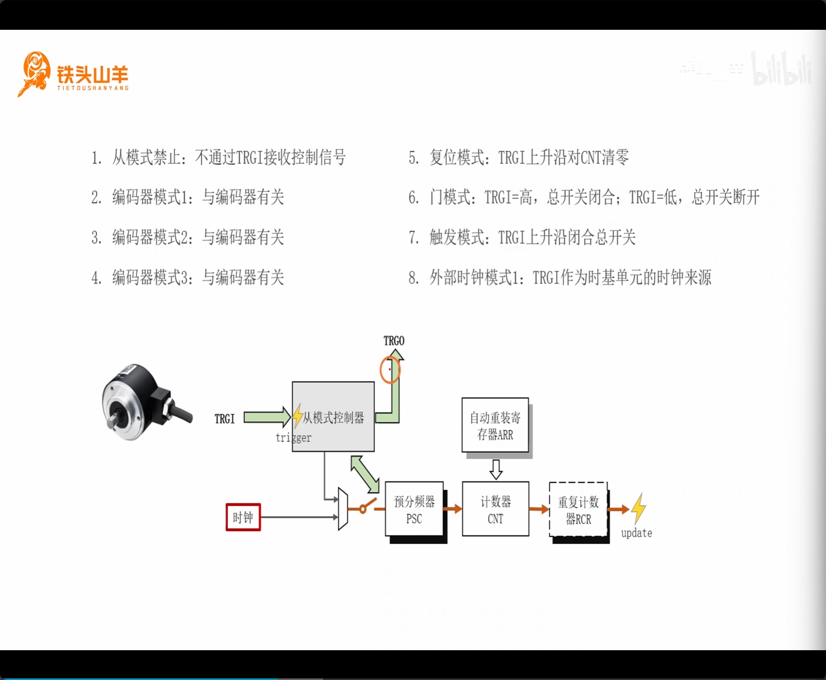 外部时钟模式 1:时钟来源为从模式控制器。CNT++跟着 TRGI 的信号走的。