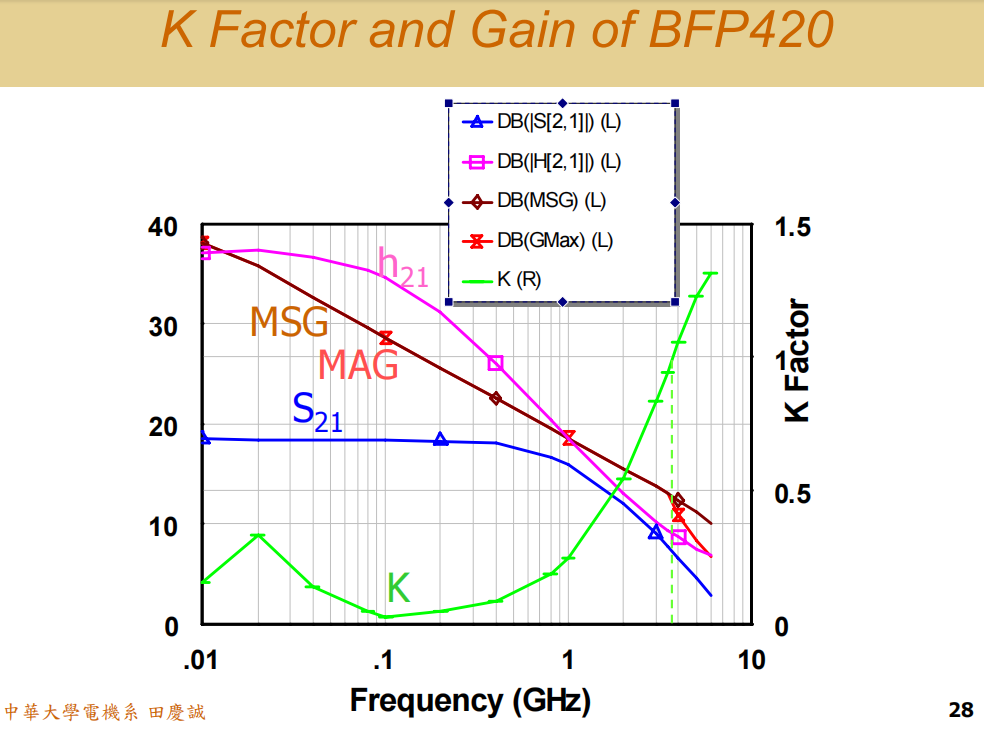 当完成整个放大器的设计(包括前后级匹配)后,我必须要求你们提供一张图:整个放大器级的 K 因子和增益随频率变化的曲线。(注意,这不是单个晶体管的,而是整个放大器的)