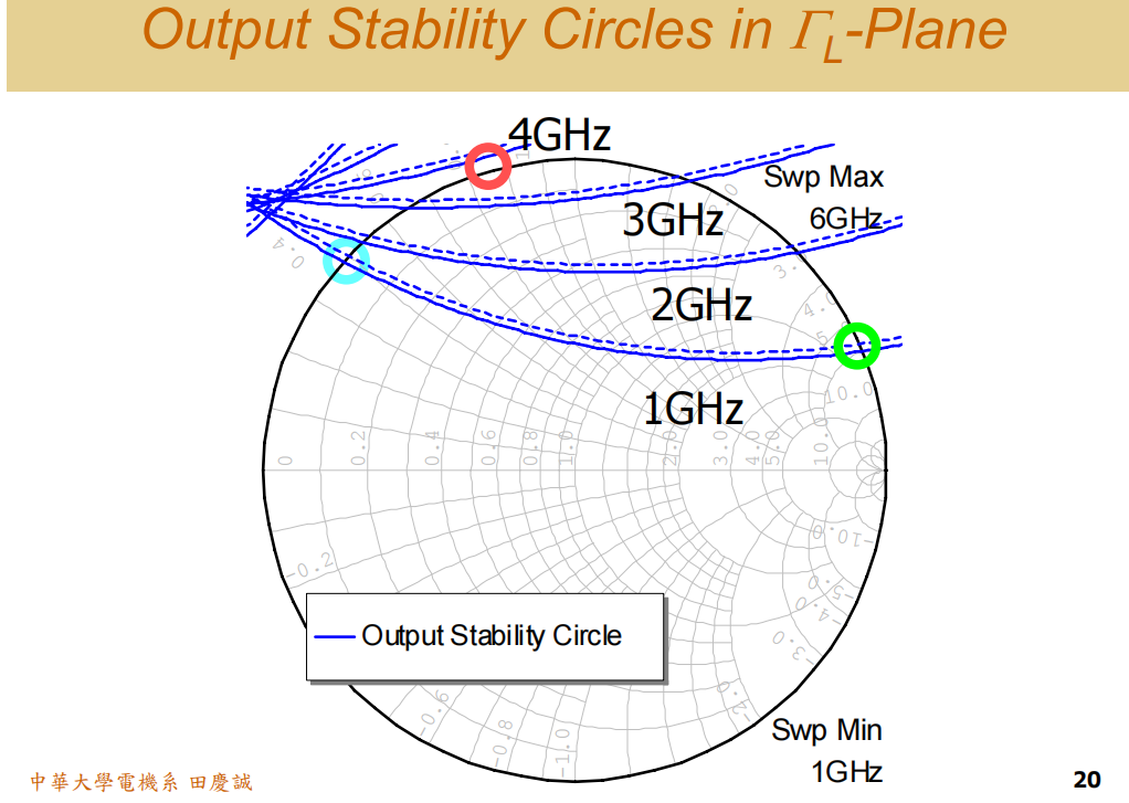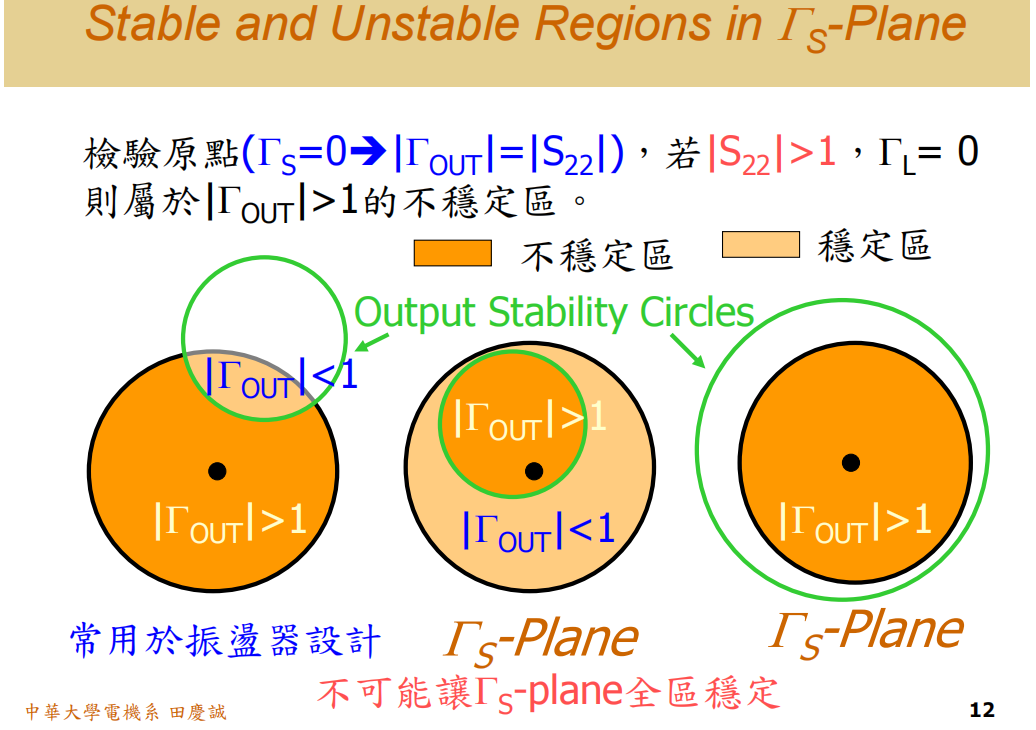 它的意思是:抱歉,有些区域你不能选 。比如在ΓSΓ_SΓS平面上,有一块区域,如果你不小心选到了这一点,并把匹配电路做成这样,那就要小心了,晶体管可能会振荡。这个区域就叫不稳定区。换句话说,有部分的ΓSΓ_SΓS值不能取。另一个例子,在ΓLΓ_LΓL平面上也可能有一块区域不能取,取到之后,整个电路可能会不稳定。这种有部分区域需要规避的情况,我们就称之为"潜在不稳定"。