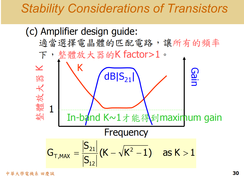- 从 MAG 公式可知,当 K=1 时,增益最大(MAG=MSG),但处于临界稳定,很危险。