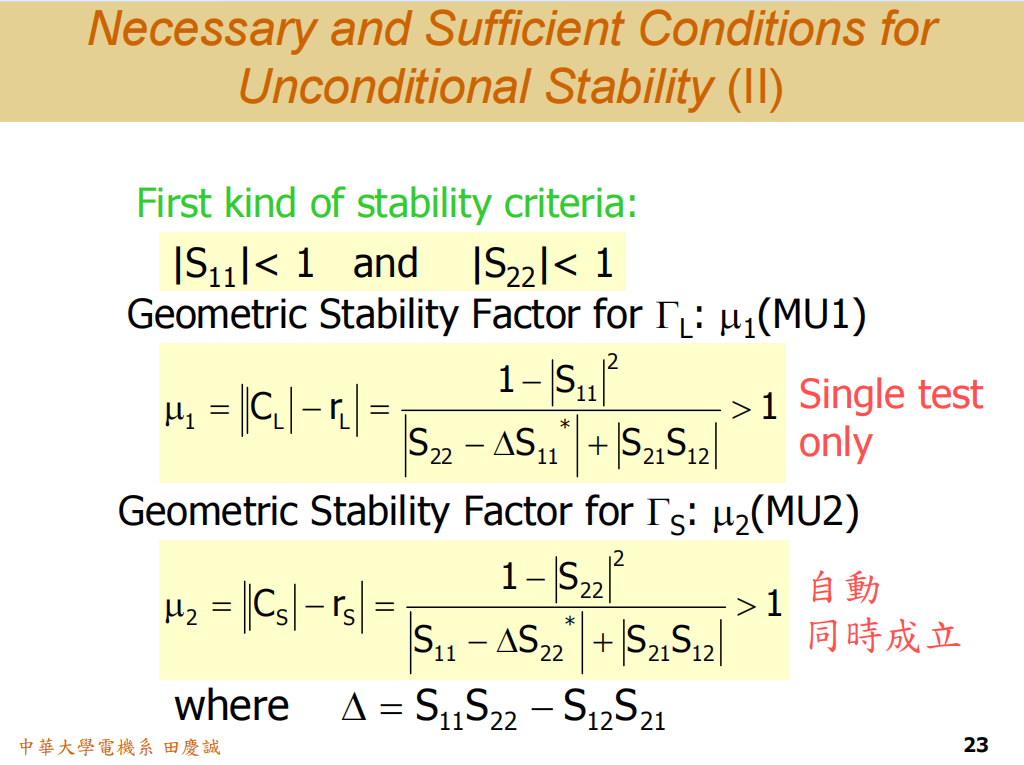 所以,满足 |ΓINΓ_{IN}ΓIN|<1 和 ΓOUTΓ_{OUT}ΓOUT|<1 这两个真正的稳定条件,就是无条件稳定。