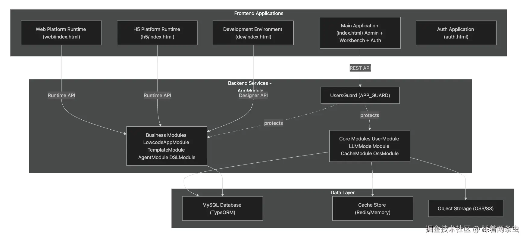 后端使用NestJS的模块系统,具有一个集中式的AppModule,协调所有核心和业务模块。全局认证通过注册为APP_GUARD的UsersGuard强制执行。