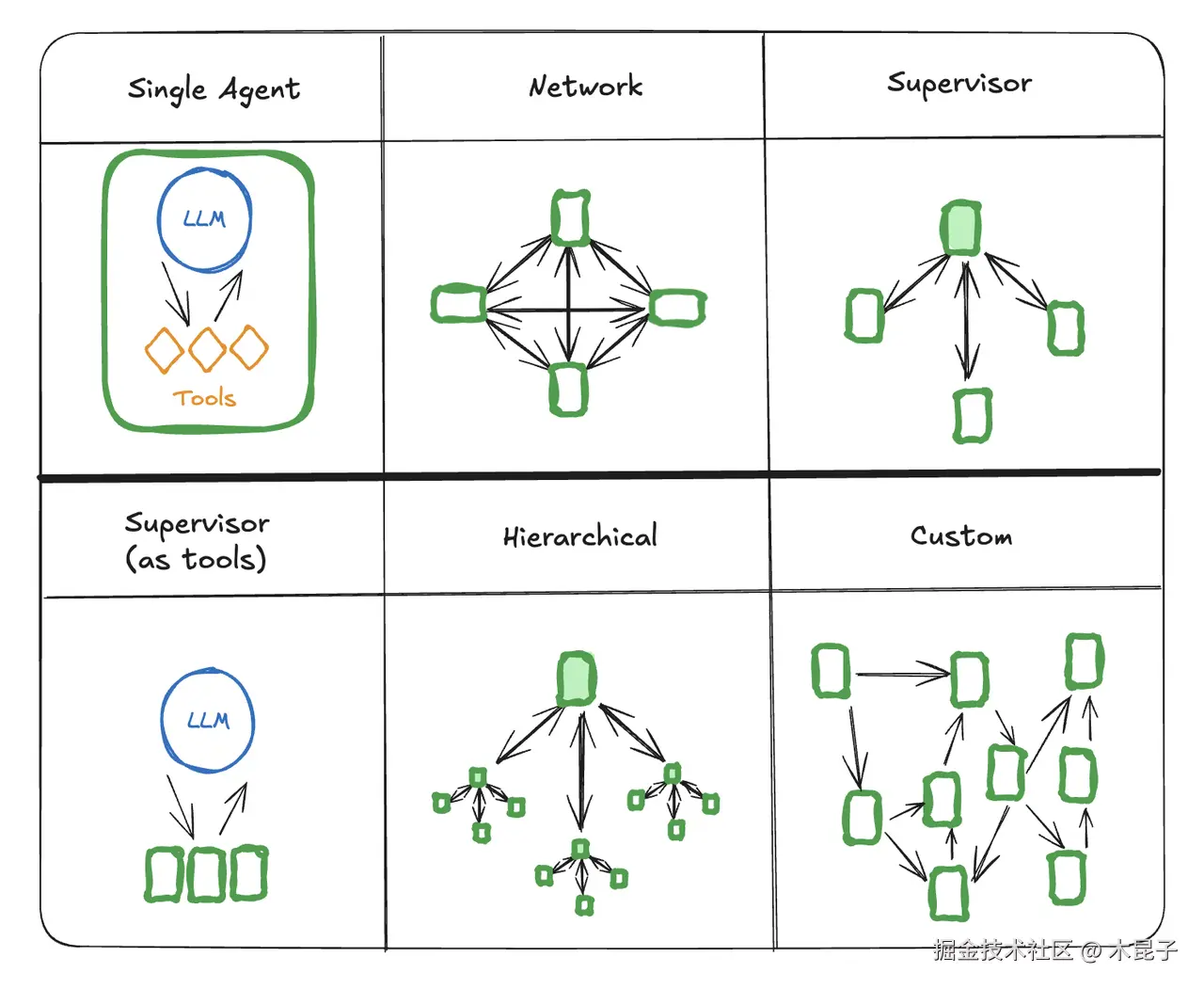 LangGraph 是基于LangChain生态构建,它强调「状态图(StateGraph)」和「可追溯记忆(Checkpoint Memory)」,它提出了几种Multi-Agent模式,适用于不同的调用逻辑和控制流需求: