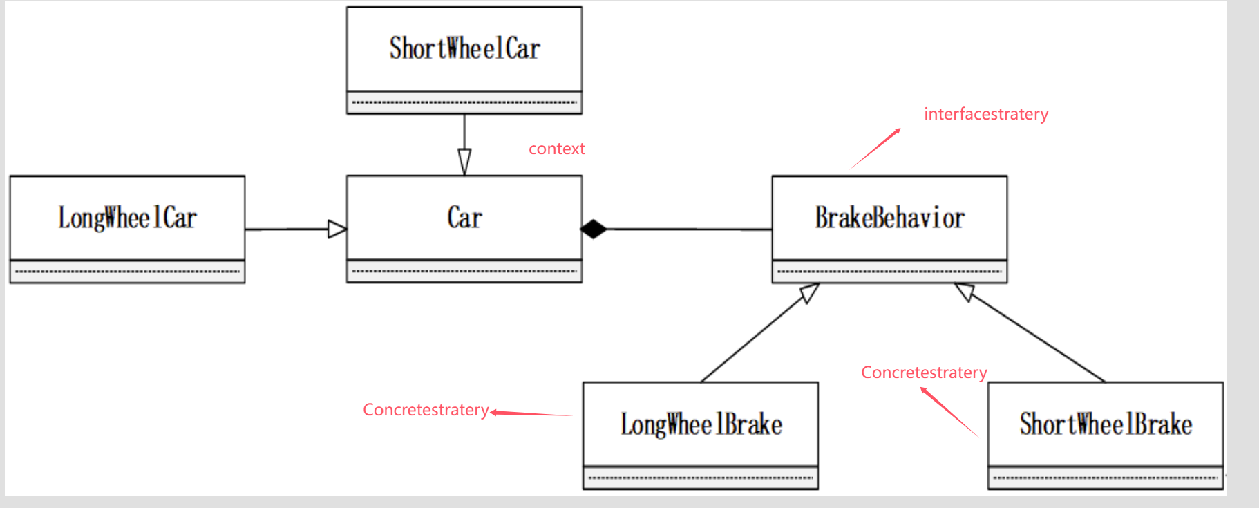 javainterface BrakeBehavior { public abstract void stop(); } /** 此部分代码需要你编写并提交! **/ public class Main { public static void main(String[] args) { BrakeBehavior brake1 = new ShortWheelBrake(); BrakeBehavior brake2 = new LongWheelBrake(); Car car = new ShortWheelCar(brake1); car.brake(); car = new LongWheelCar(brake2); car.brake(); } }