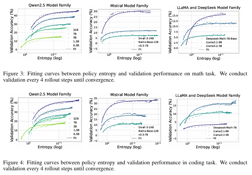 如图所示,作者的实验结果发现能拟合一条曲线;同时,训练初期,熵就迅速坍塌,随后模型性能提升进入平坦区域,只有微小的5%的提升。