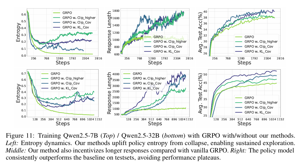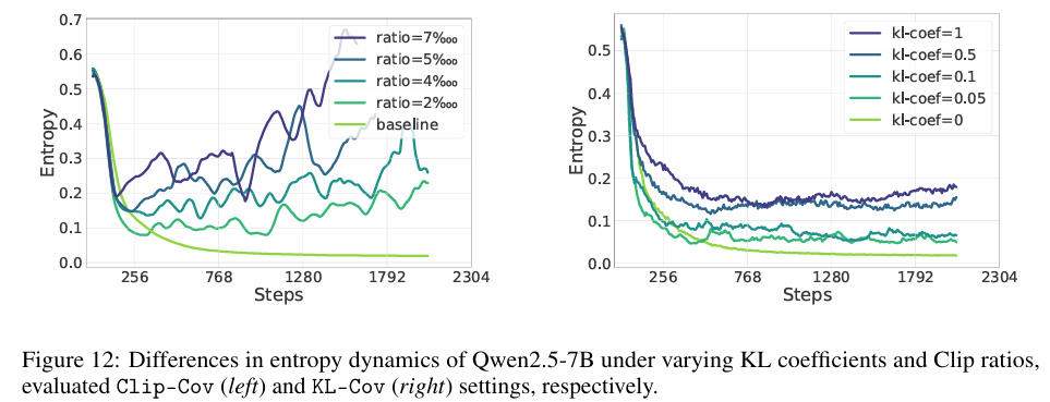 - 熵保持: 当基线GRPO的熵降至接近0时,KL-Cov方法的熵仍保持在10倍以上的水平。