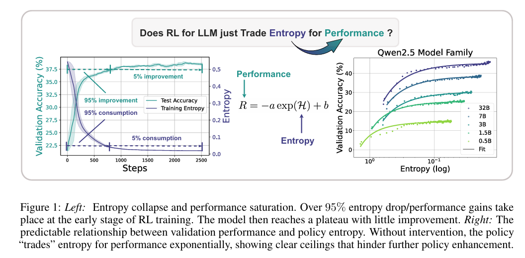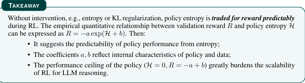 - 性能饱和与可预测性: 随着熵的消失,模型性能迅速达到瓶颈。论文发现性能 R R R 和熵 H \mathcal{H} H 之间存在严格的指数关系,意味着一旦熵耗尽,性能也就封顶了。