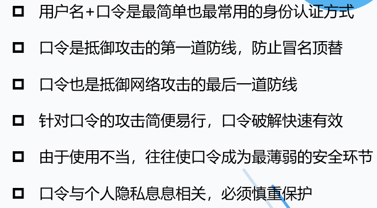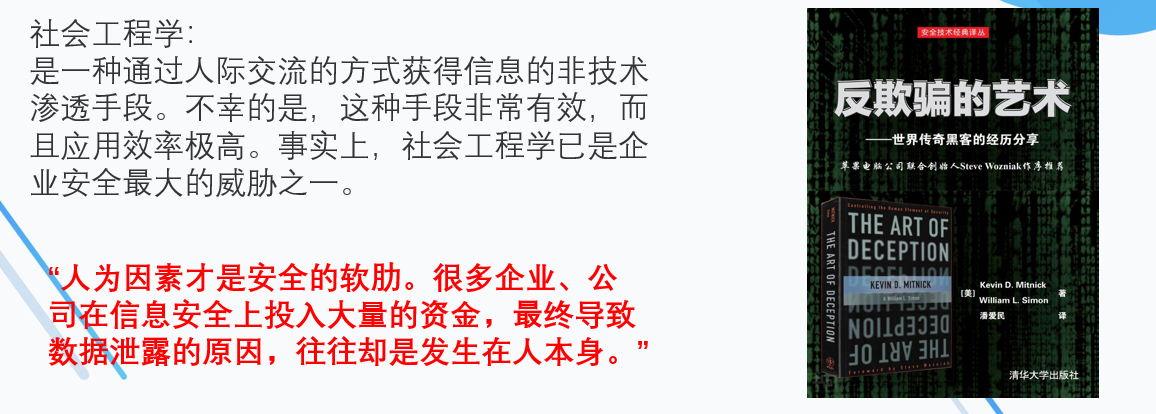 这里部分的话,就是说不要用弱口令啊、电脑要装杀毒软件、离开电脑要锁屏还有社会工程学什么的内容。我这里也就举例一点内容。不多作介绍了