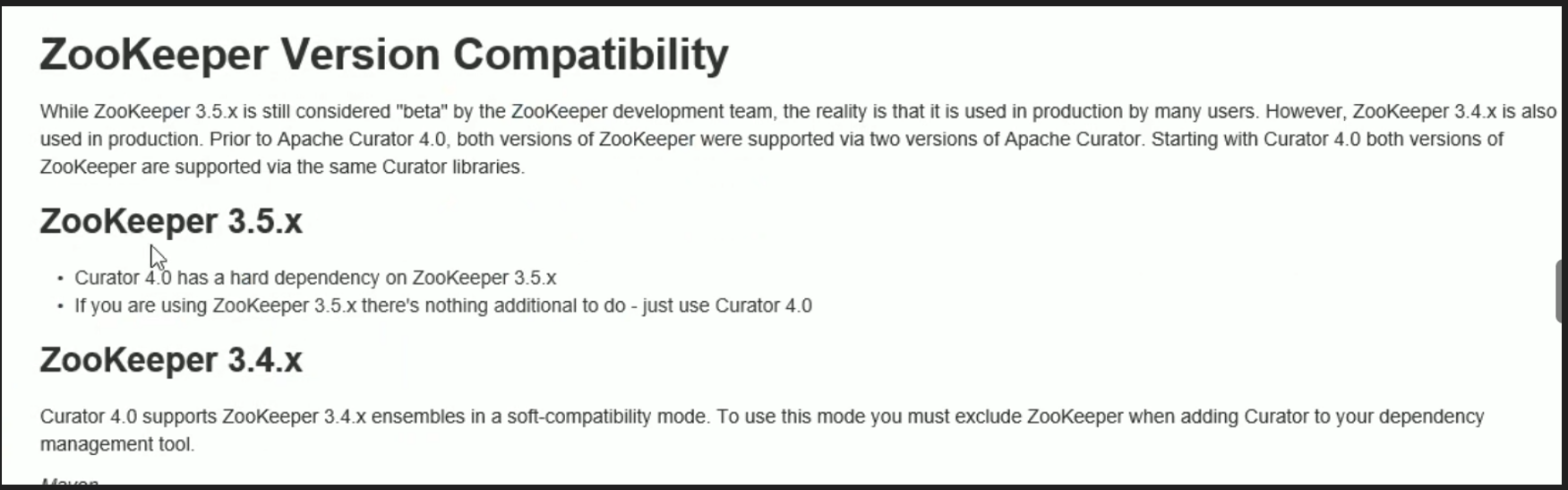 使用Curator来操作Zookeeper,所以对于二者的版本是有要求的。如果使用Zookeeper3.5版本,对应的Curator是4.0版本;同时Curator4.0版本兼容Zookeeper3.4版本