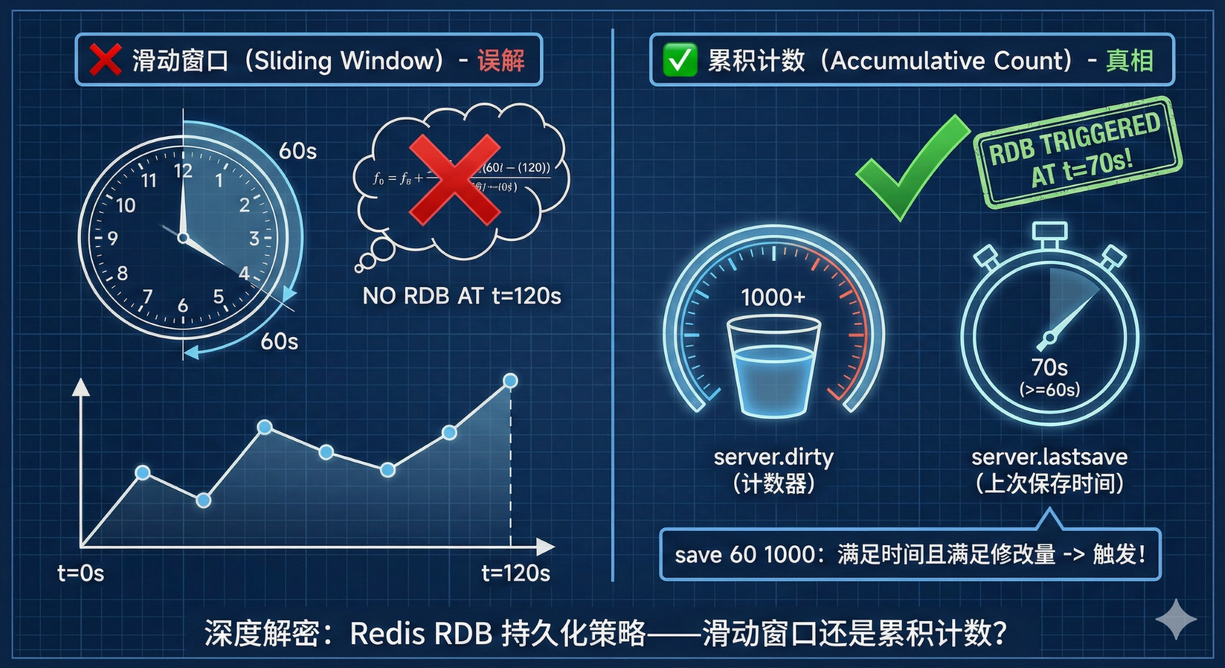 不要被"滑动窗口"等复杂概念误导。在高性能中间件的设计中,简单往往意味着高效。Redis 不会为了持久化判断去维护复杂的历史时间线,一个时间戳加一个计数器,足矣。