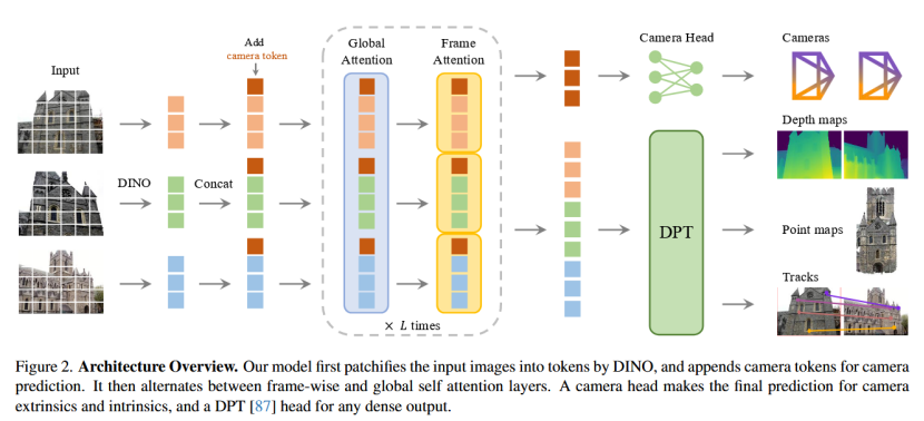 - 交替方式:层级交替进行帧内和全局注意力,默认 L = 24 L=24 L=24 层(即总48层注意力层,交替叠加),在不同图像间整合信息的同时,归一化每个图像内令牌的激活值。
