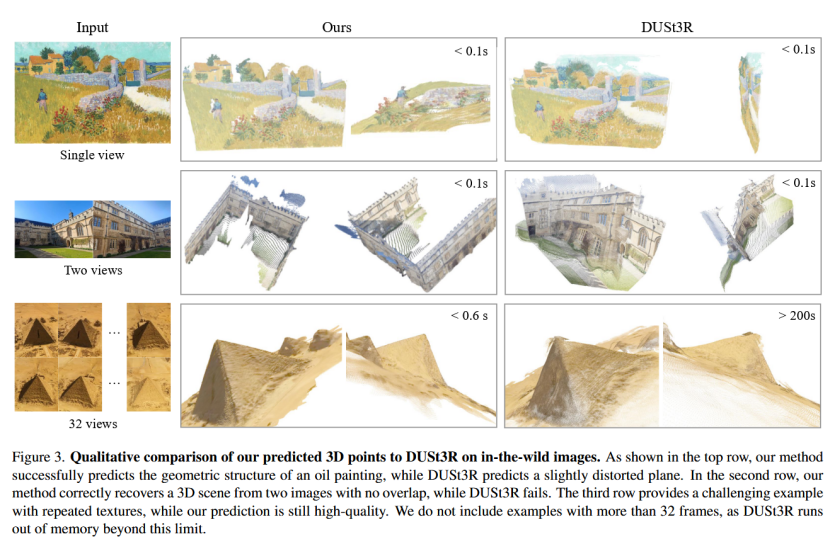 动机一:传统方法依赖于迭代优化技术(如Bundle Adjustment, BA)来实现相机参数估计、点云重建等任务,但这些方法复杂、计算成本高,通常需要结合机器学习辅助(如特征匹配或单目深度预测)。作者指出,随着神经网络的强大(如大型Transformer模型),可以尝试用前馈网络直接解决3D重建问题,而几乎完全避免几何后处理。这是对现有方法的进一步推进,例如DUST3R和MASt3R只能处理两张图像,需要昂贵的后处理(如全局对齐)来融合多视图结果,而VGGT旨在从单张、少量或数百张图像中一次性预测所有关键3D属性(相机参数、深度图、点图、点跟踪),在不到1秒内完成,且直接输出结果往往优于基于优化的方法。