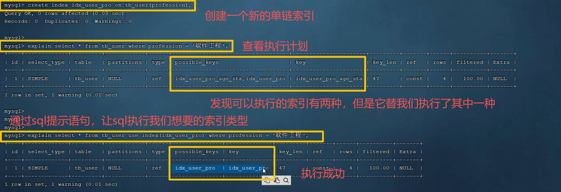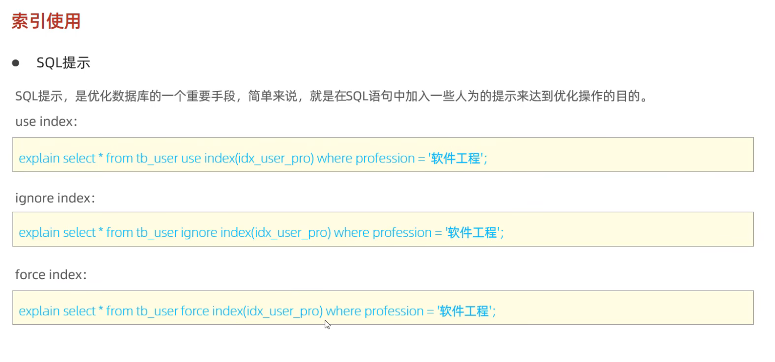 使用场景:当优化器选择的索引不是最优时,可以使用提示强制指定索引。
