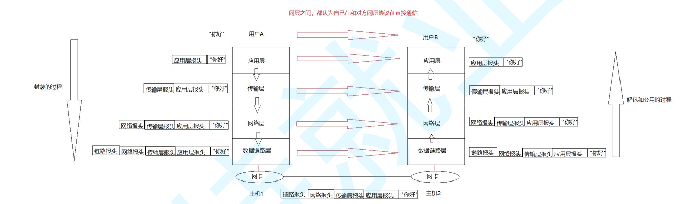 在网络传输的过程中,数据不是直接发送给对方主机的,而是先要自定向下将数据交 付给下层协议,最后由底层发送,然后由对方主机的底层来进行接受,在自底向上进 行向上交付,
