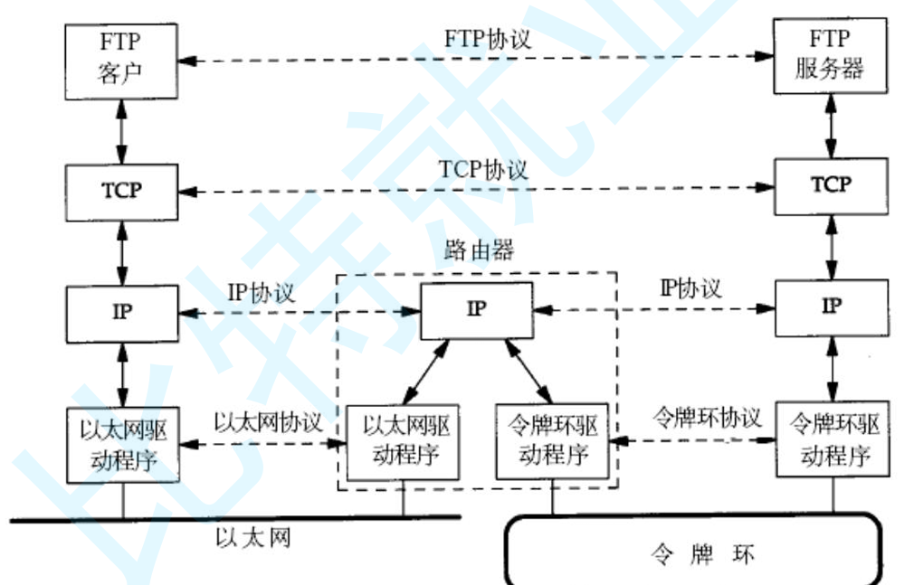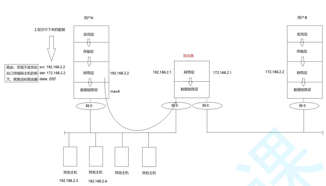 跨网段的主机的数据传输.数据从一台计算机到另一台计算机传输过程中要经过一个或 多个路由器. 下面是一张示意图: