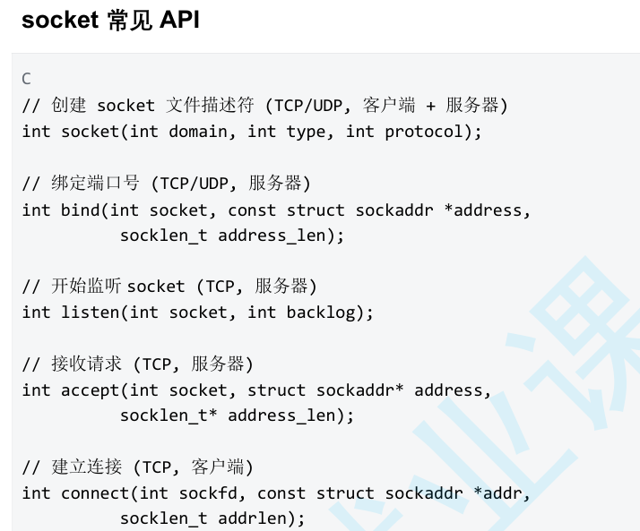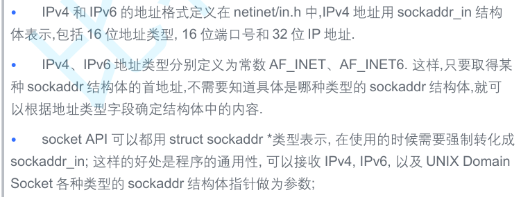 socket API 是一层抽象的网络编程接口,适用于各种底层网络协议,如IPv4、IPv6,以及 后面要讲的UNIXDomainSocket.然而,各种网络协议的地址格式并不相同.
