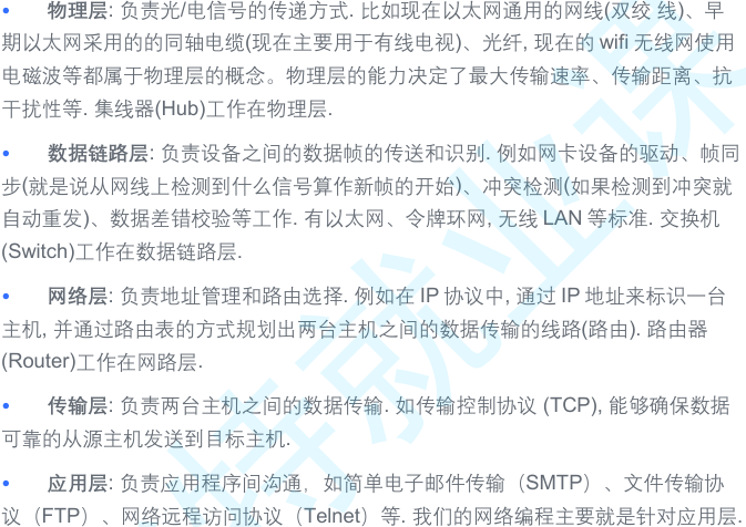 • 对于集线器,它只实现了物理层; 但是并不绝对.很多交换机也实现了网络层的转发;很多路由器也实现了部分传输层的 内容(比如端口转发)