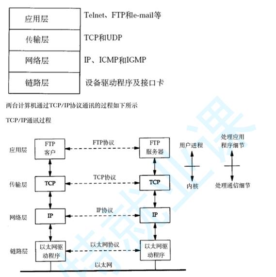 TCP/IP是一组协议的代名词,它还包括许多协议,组成了TCP/IP协议簇. TCP/IP通讯协议采用了5层的层级结构,每一层都呼叫它的下一层所提供的网络来完 成自己的需求.