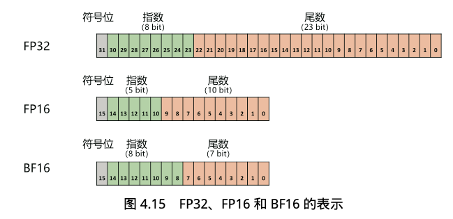 - FP16 中第 15 位为符号位,第 14 位∼第 10 位用于表示指数,第 9 位∼第 0 位用于表示尾数。