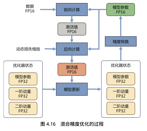 混合精度训练(Mixed PrecisionTraining)方式,即同时存在F P3 与 FP16 或者 BF16 格式。