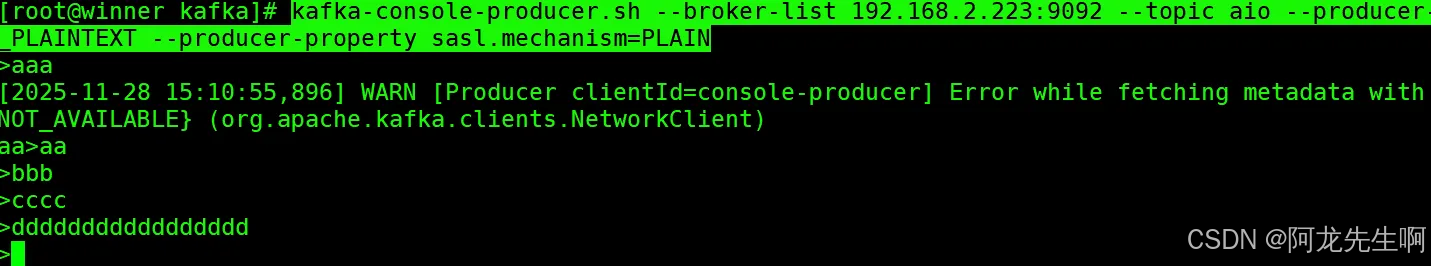 kafka-console-producer.sh --broker-list 192.168.2.223:9092 --topic aio --producer-property security.protocol=SASL_PLAINTEXT --producer-property sasl.mechanism=PLAIN