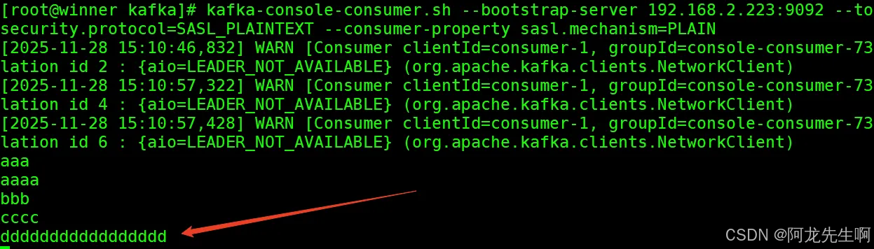 kafka-console-consumer.sh --bootstrap-server 192.168.2.223:9092 --topic aio --from-beginning --consumer-property security.protocol=SASL_PLAINTEXT --consumer-property sasl.mechanism=PLAIN