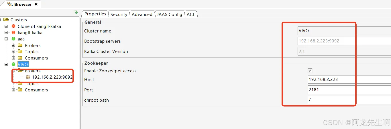 此配置定义了两个用户(admin和test)。KafkaServer中的username、password配置的用户和密码,是用来broker和broker连接认证。在本例中,admin是代理broker间通信的用户。user_userName 配置为连接到broker的所有用户定义密码,broker使用这些验证所有客户端连接,包括来自其他broker的连接。