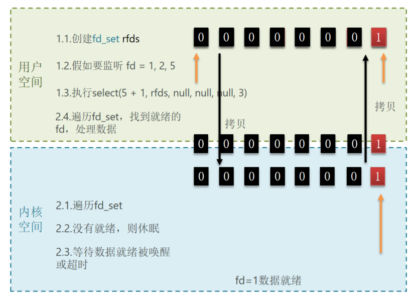 会有两次数据拷贝,并且要得知具体是哪个FD就绪,需要遍历。