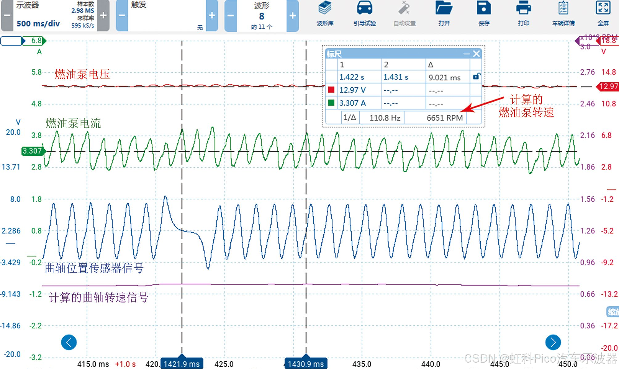 仔细观察燃油泵电流波形,发现电流波动8次为1个周期,即燃油泵旋转1圈。放大燃油泵电流为3.4 A左右时的相关波形,通过使用时间标尺计算出燃油泵转速约为6 650 r/min(图4)。